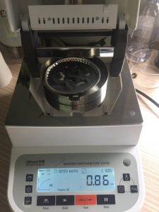 - 測試稀土:為了使測試過(guò)程中稀土水分測試儀將稀土烘干烘透,我們將稀土分散開(kāi)來(lái),以便溫度能滲透進(jìn)稀土內部。取1克多稀土撒于不銹鋼托盤(pán)中,用勺子將稀土平鋪均勻至鋪滿(mǎn)整個(gè)盤(pán)中,為避免稀土高溫烘烤后除水分外的其他物質(zhì)也同樣揮發(fā)掉,我們將溫度設置在100℃就好,按“START”鍵開(kāi)始測試,2分03秒后檢測結束,檢測數據顯示0.86%;